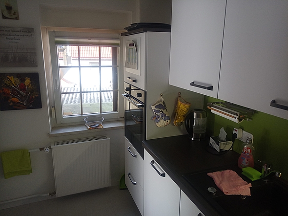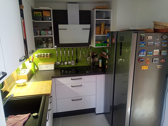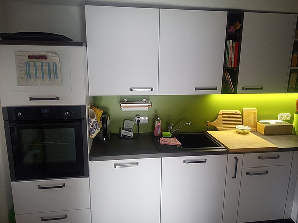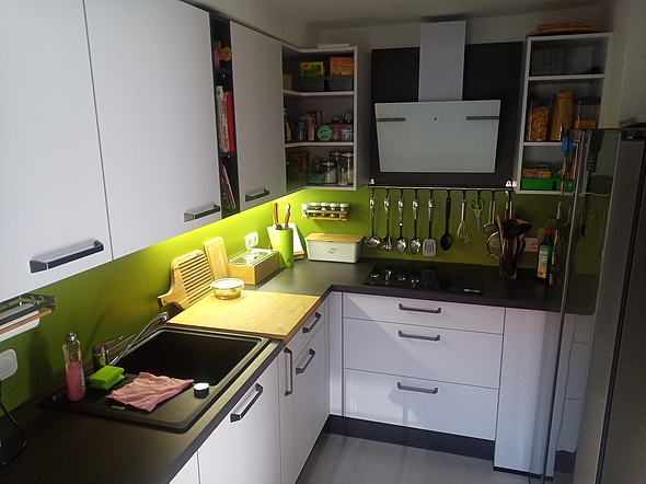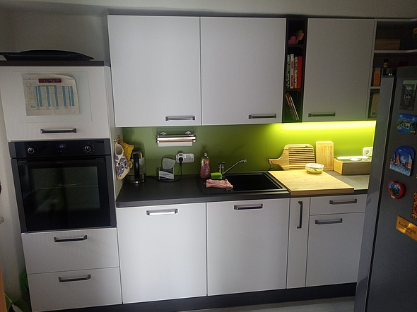 Diese Kunden-Referenzküche verbindet moderne Akzente mit durchdachter Funktionalität. Die weißen Schränke in Kombination mit einer kontrastierenden dunklen Arbeitsplatte schaffen ein harmonisches Ambiente. Das auffällige grüne Rückwand-Panel verleiht der Küche eine frische und lebendige Note, während die platzsparende Aufteilung optimale Arbeitsbedingungen ermöglicht. Praktische Details wie die Aufhängungen für Küchenutensilien und das integrierte Regal für Gewürze sorgen für Ordnung und erleichtern den Zugriff. Lassen Sie sich von unseren Referenzküchen inspirieren und planen Sie Ihre individuelle Traumküche mit uns – stilvoll und funktional direkt beim Kunden umgesetzt!
