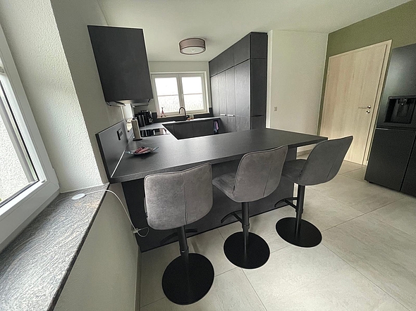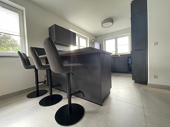 Diese Küche beeindruckt durch ihr minimalistisches Design in elegantem Dunkelgrau und bietet eine großzügige Arbeitsfläche für komfortables Kochen. Die hohen Schränke und die nahtlos integrierte Theke mit bequemen Barstühlen schaffen sowohl Stauraum als auch einen gemütlichen Sitzbereich. Die offenen Fenster lassen viel Tageslicht herein, das die matten Oberflächen stilvoll beleuchtet. Perfekt für alle, die eine moderne, schlichte Ästhetik mit hoher Funktionalität bevorzugen. Lassen Sie sich inspirieren und gestalten Sie Ihre persönliche Traumküche – elegant, funktional und maßgeschneidert für Ihr Zuhause!