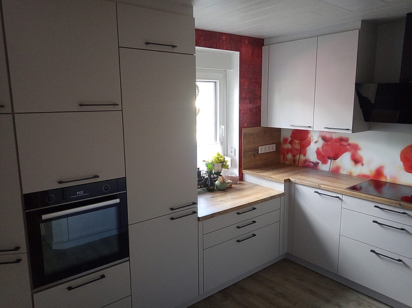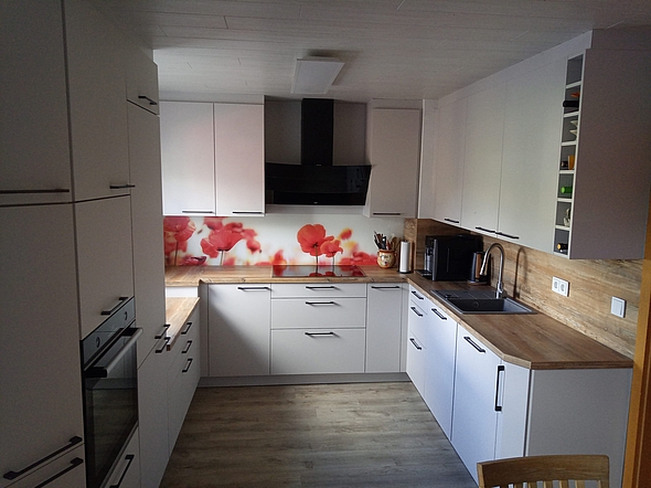 Diese moderne Küche kombiniert klare, weiße Fronten mit einer auffälligen Glasrückwand in einem leuchtenden Mohnblumenmotiv. Die warmen Holzelemente der Arbeitsplatten ergänzen das frische Design perfekt und schaffen eine einladende Atmosphäre. Die durchdachte Anordnung der Schränke und Geräte sorgt für maximale Funktionalität und viel Stauraum. Diese stilvolle Küche ist nicht nur ein optisches Highlight, sondern bietet auch alles, was für eine komfortable und effiziente Nutzung im Alltag notwendig ist. Ideal für alle, die modernes Design mit natürlichen Akzenten schätzen.