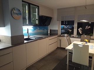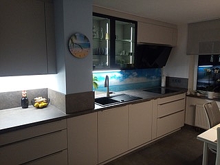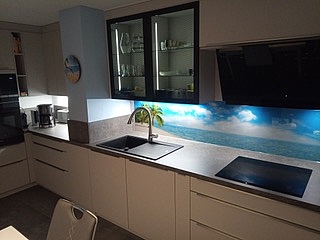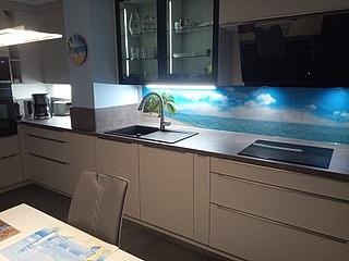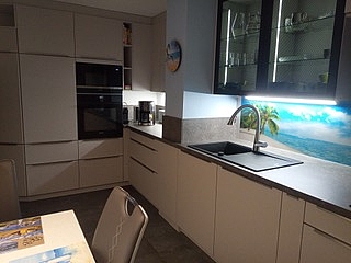Diese moderne Küche überzeugt mit einem harmonischen Farbkonzept aus warmen Beigetönen, grauen Arbeitsplatten und stilvollen Glasfronten. Das Highlight: die beeindruckende Küchenrückwand mit Meerblick-Motiv, die Urlaubsstimmung in den Raum bringt. Hochwertige Geräte, durchdachte Stauraumlösungen und ein offenes Raumkonzept machen diese Küche zu einem echten Wohlfühlort. Perfekt für stilbewusste Genießer, die Design und Funktionalität vereinen möchten!