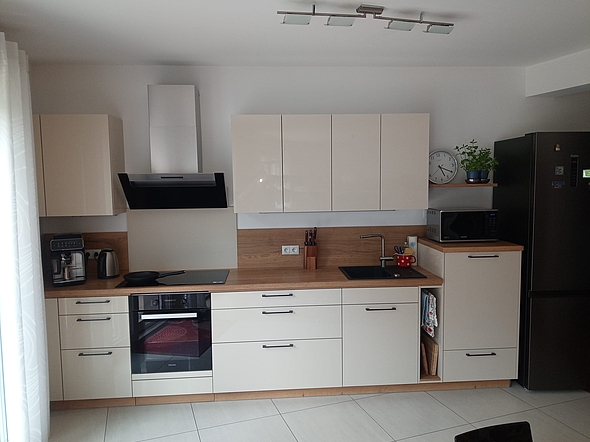 Diese Küche überzeugt durch ihre elegante Kombination aus weißen Fronten und Holzdetails. Die klare Linienführung und die hochwertigen Geräte machen das Kochen zum Vergnügen. Der großzügige Arbeitsbereich und die praktischen Schränke bieten viel Stauraum. Mit modernen Akzenten wie der Edelstahl-Dunstabzugshaube und integrierten Küchengeräten wird diese Küche zum Herzstück jedes Hauses. Perfekt für alle, die Wert auf Stil und Funktionalität legen.